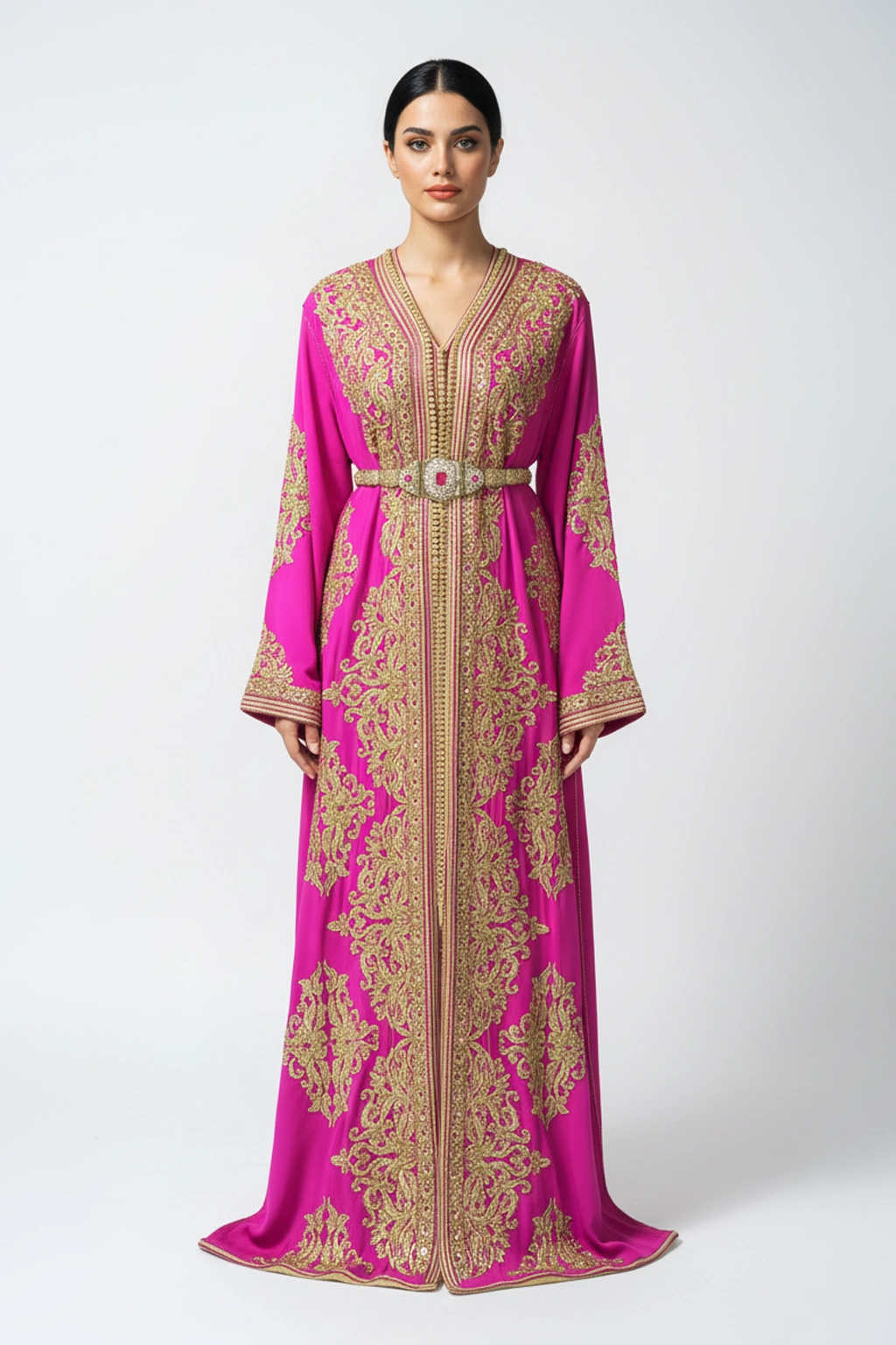 Ce tekchita fuchsia lumineux magnifie la silhouette avec ses broderies dorées foisonnantes, évoquant un travail artisanal d’exception. Sa coupe fluide et longue, complétée par des emmanchures légèrement évasées, assure une élégance naturelle et un confort optimal. Idéal pour sublimer vos grandes occasions d’une touche vive et raffinée.