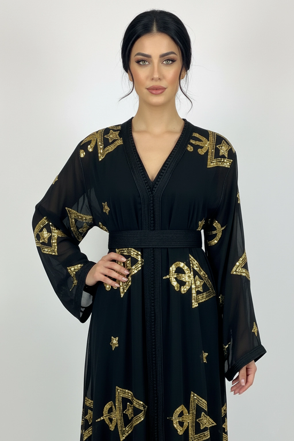 Ce tekchita en chiffon noir léger se distingue par ses motifs dorés graphiques qui apportent une touche moderne à ce vêtement traditionnel. Sa coupe longue et cintrée à la taille, associée à une ceinture large en textile, garantit une silhouette élégante et confortable. Parfait pour une allure chic et aérienne lors de vos soirées.